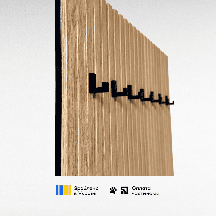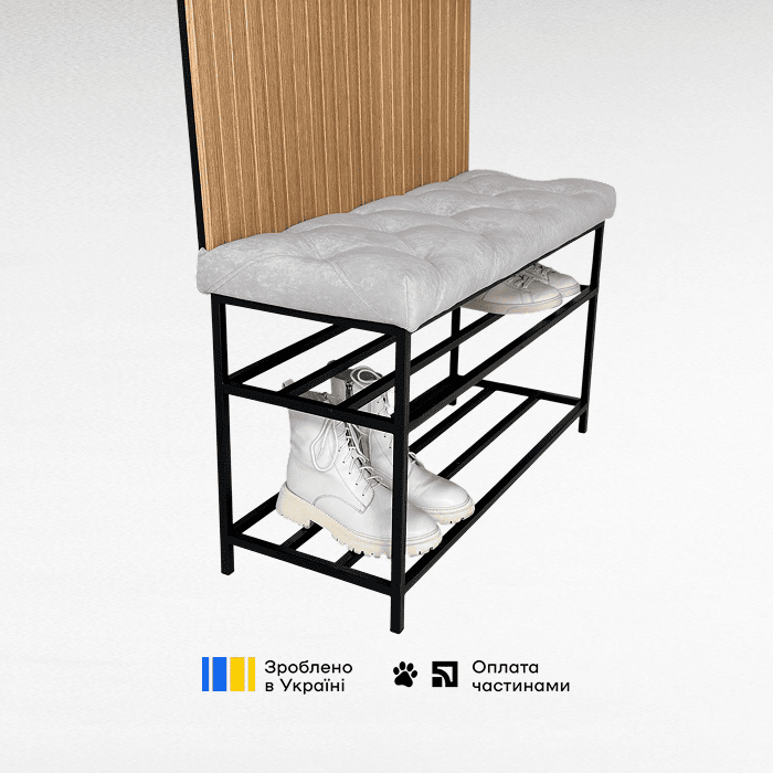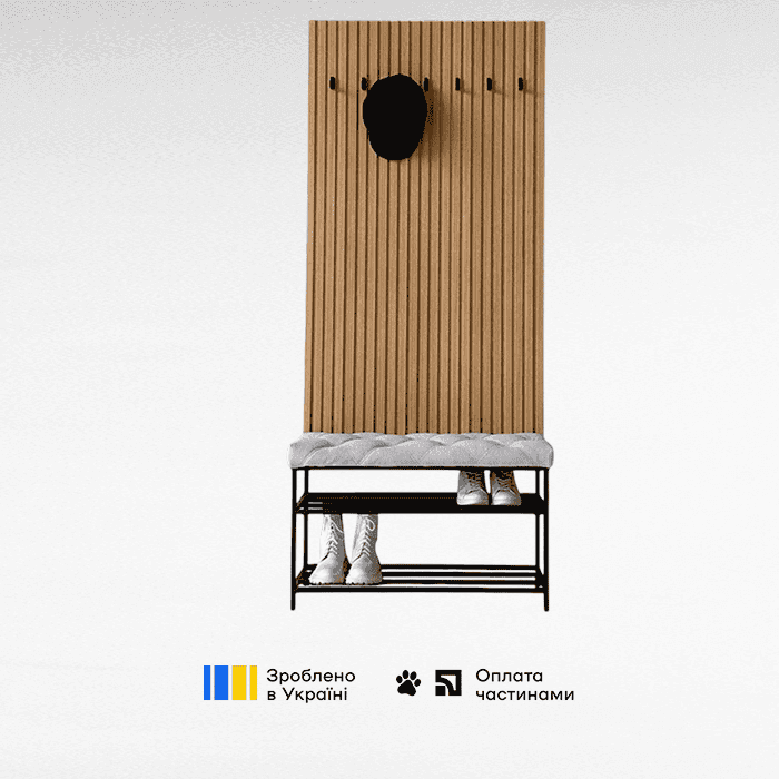 Комплект складається із банкетки з комфортним м’яким сидінням товщиною 60-70 мм і окремої стінової панелі з МДФ-рейок висотою 1200 мм, яку можна повісити на будь-якій висоті.